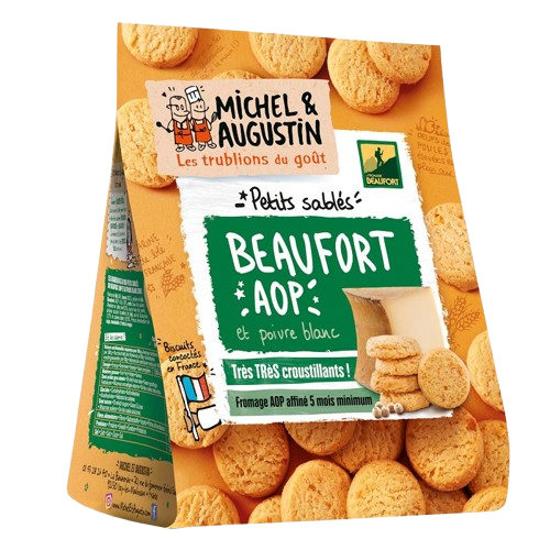 Liste d’ingrédients : Biscuits sablés salés au Beaufort AOP et au poivre blanc, aromatisés farine de blé 53%, beurre 30,5 %, amidon de blé, beaufort AOP râpé 10 %, œufs frais de poules élevées en plein air 6,3%, sucre roux de canne, arôme naturel (contient du lait et de l’orge), sel de Guérande 1,7 % et poivre blanc 0,15 %.